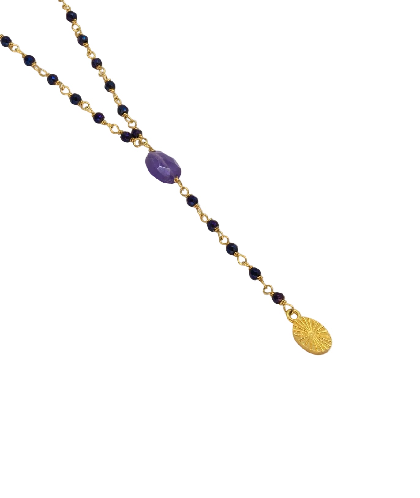 The Blue Metal India Rosary reimagines our iconic India chain with blue hematite beads that shimmer with deep, luminous reflections. It is adorned with a small engraved medallion, mounted on a brass base plated with 18-karat gold (1 micron).
