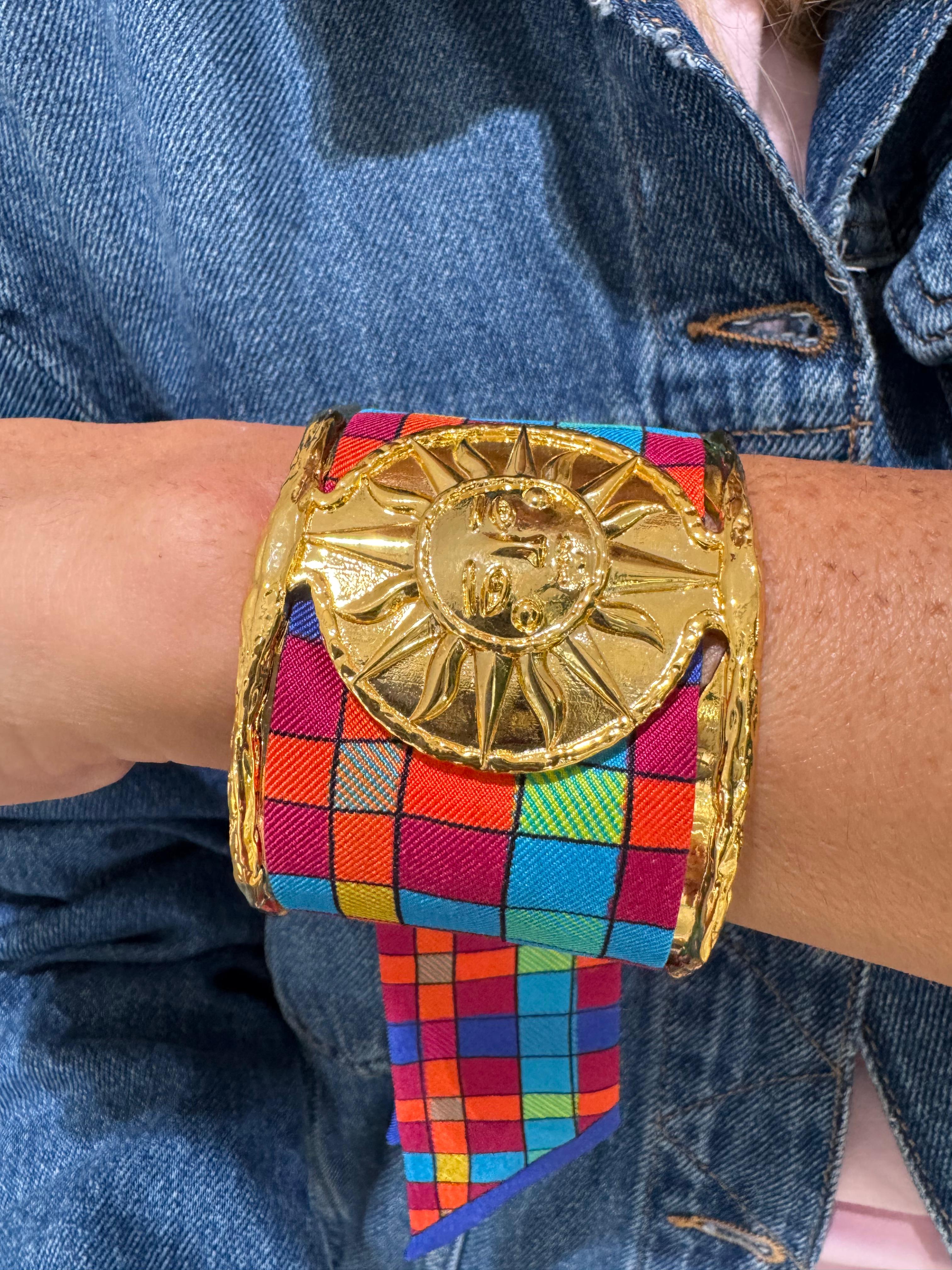 The Tartan-Pop ribbon is a playful reinvention of the classic tartan pattern, reimagined in a bold palette of red, blue, green, and gold. Its colorful checks bring a modern, energetic twist to a timeless design, making it an accessory full of character and charm. Vibrant yet sophisticated, this ribbon is perfect for adding a pop of style and individuality to any look.