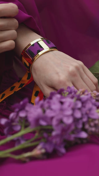 The Chapanoir ribbon is a vibrant and versatile accessory, crafted in a striking mix of deep purple, bold orange, and graphic accents. Its daring palette and modern patterns add both edge and artistry, making it the perfect detail for those who embrace expressive and unique style.