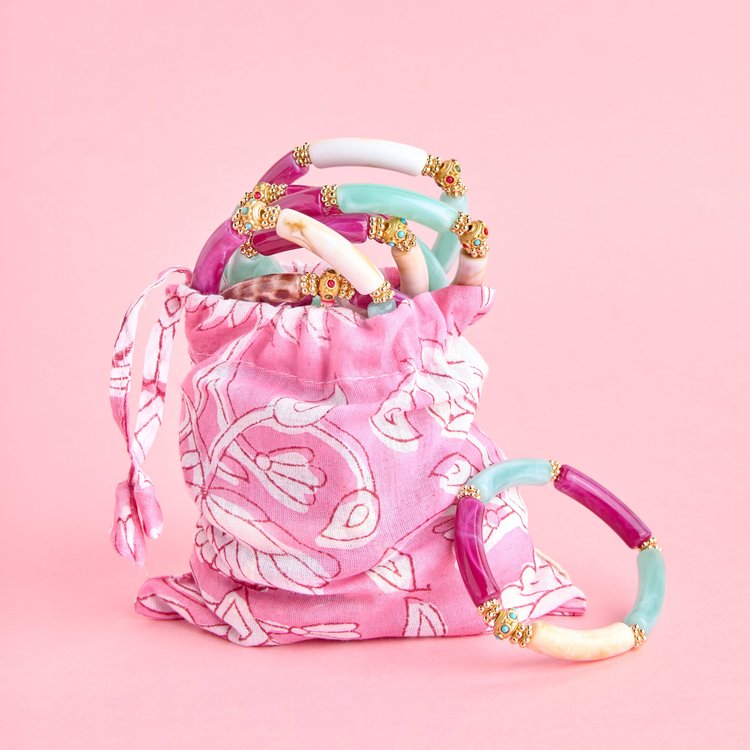 JUHU bracelets are made of acrylic beads, decorated with gold inserts and embellished with a colorful donut, mounted on a strong elastic thread.