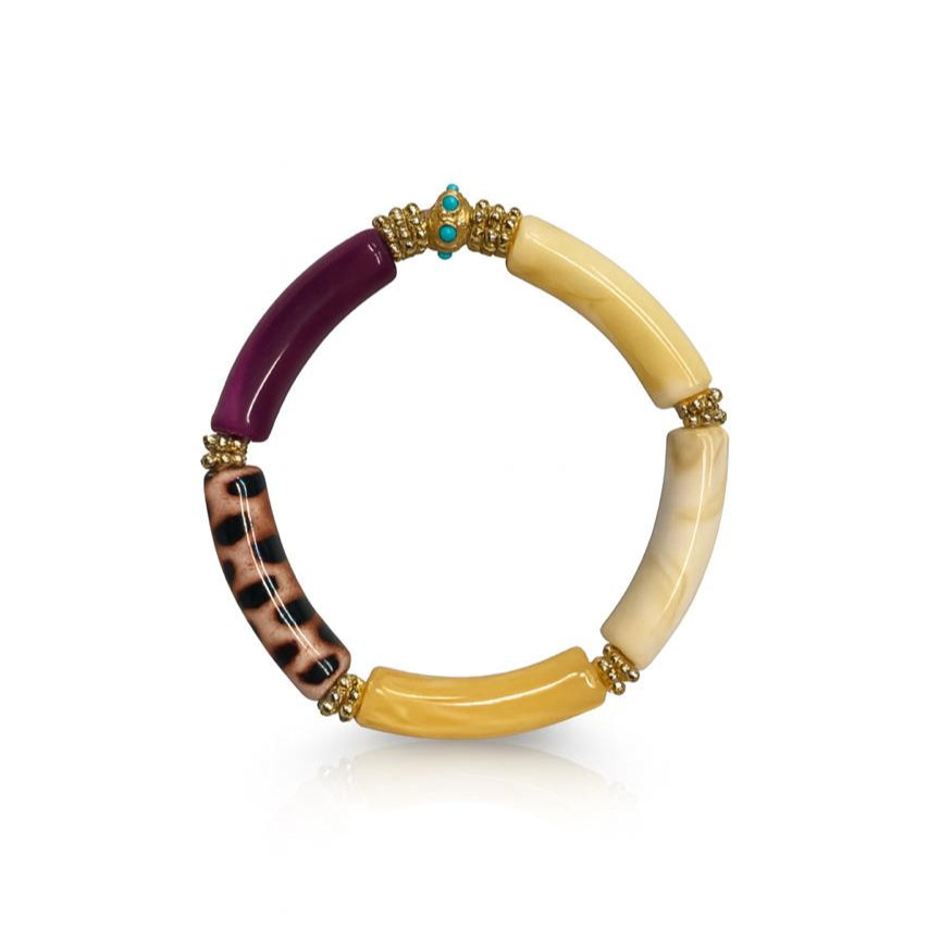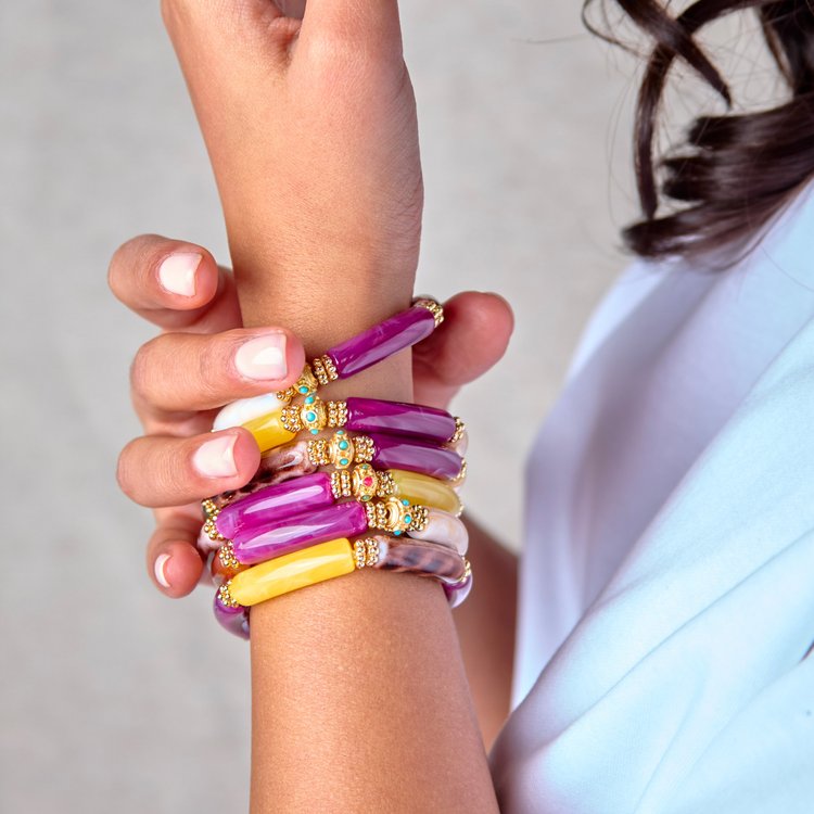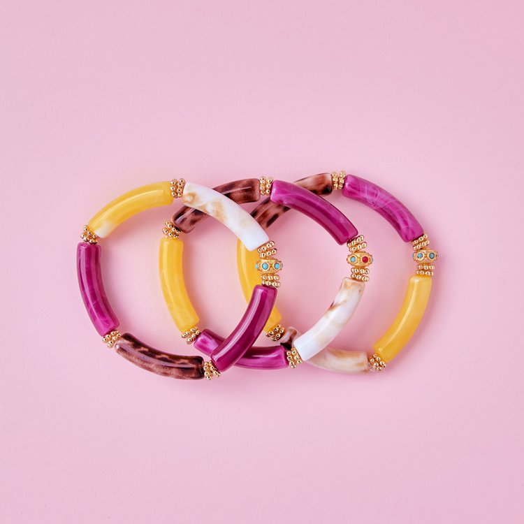 JUHU bracelets are made of acrylic beads, decorated with gold inserts and embellished with a colorful donut, mounted on a strong elastic thread.