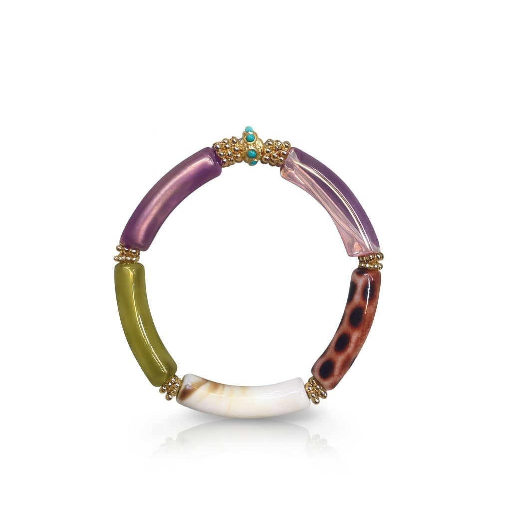 JUHU bracelets are made of acrylic beads, decorated with gold inserts and embellished with a colorful donut, mounted on a strong elastic thread.