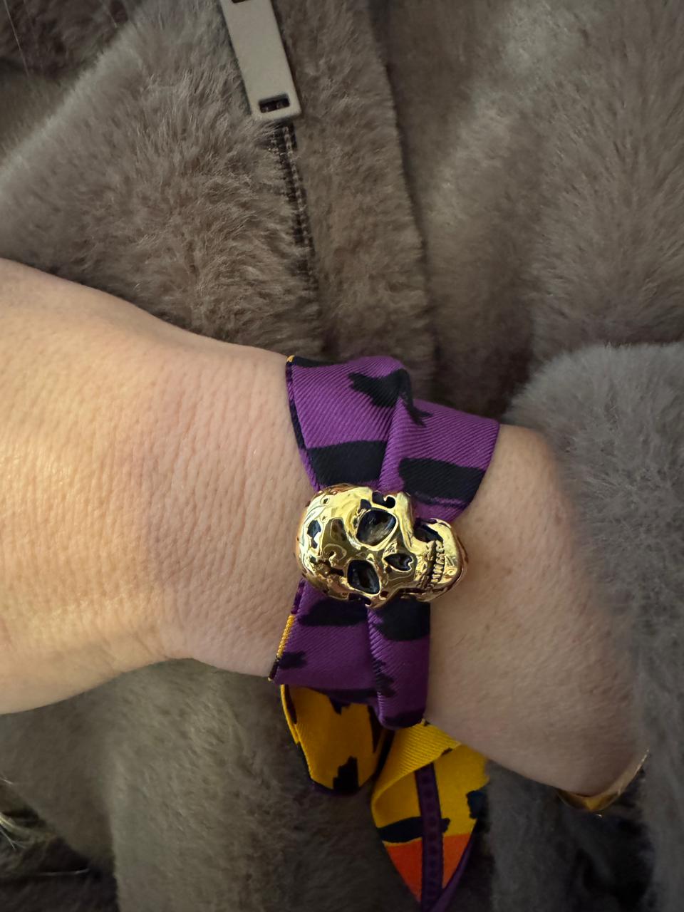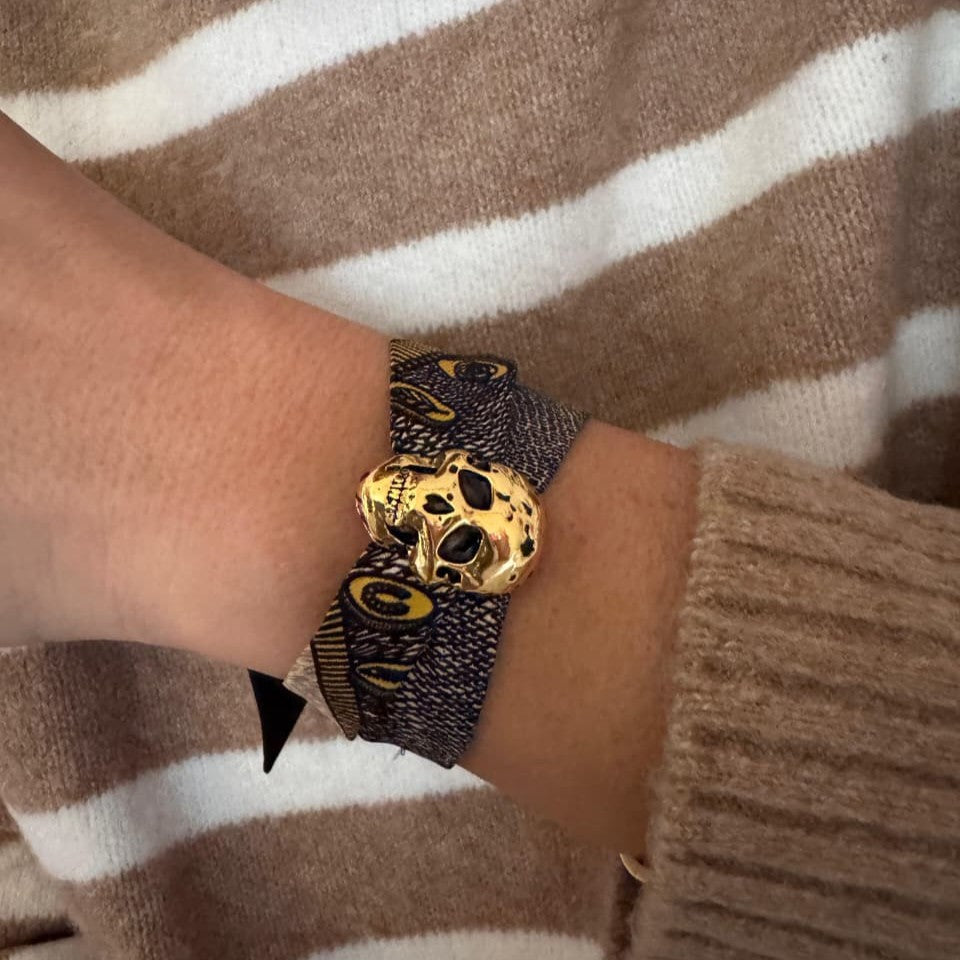 The Pirate Cuff features a sculpted skull motif paired with a silk ribbon bracelet.