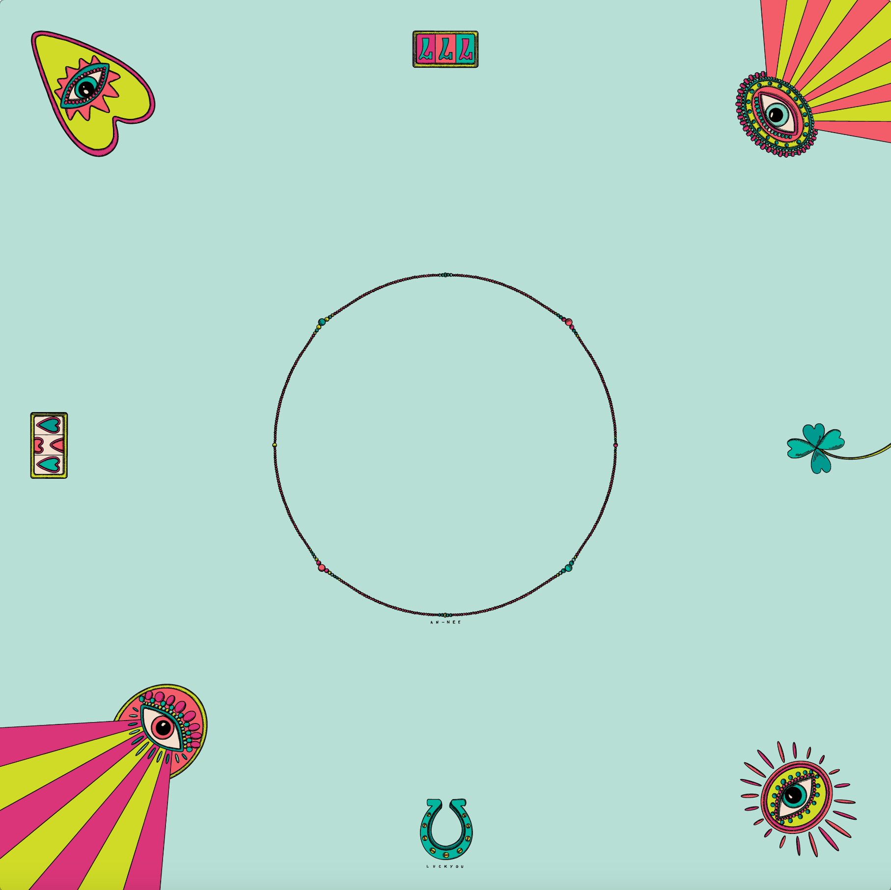 A small square scarf in fresh mint tones, designed around symbols of luck placed along the edges. Its 55 × 55 cm size makes it easy to style in multiple ways — around the neck, on the wrist, or tied to a bag — allowing different motifs to appear depending on how it’s worn.