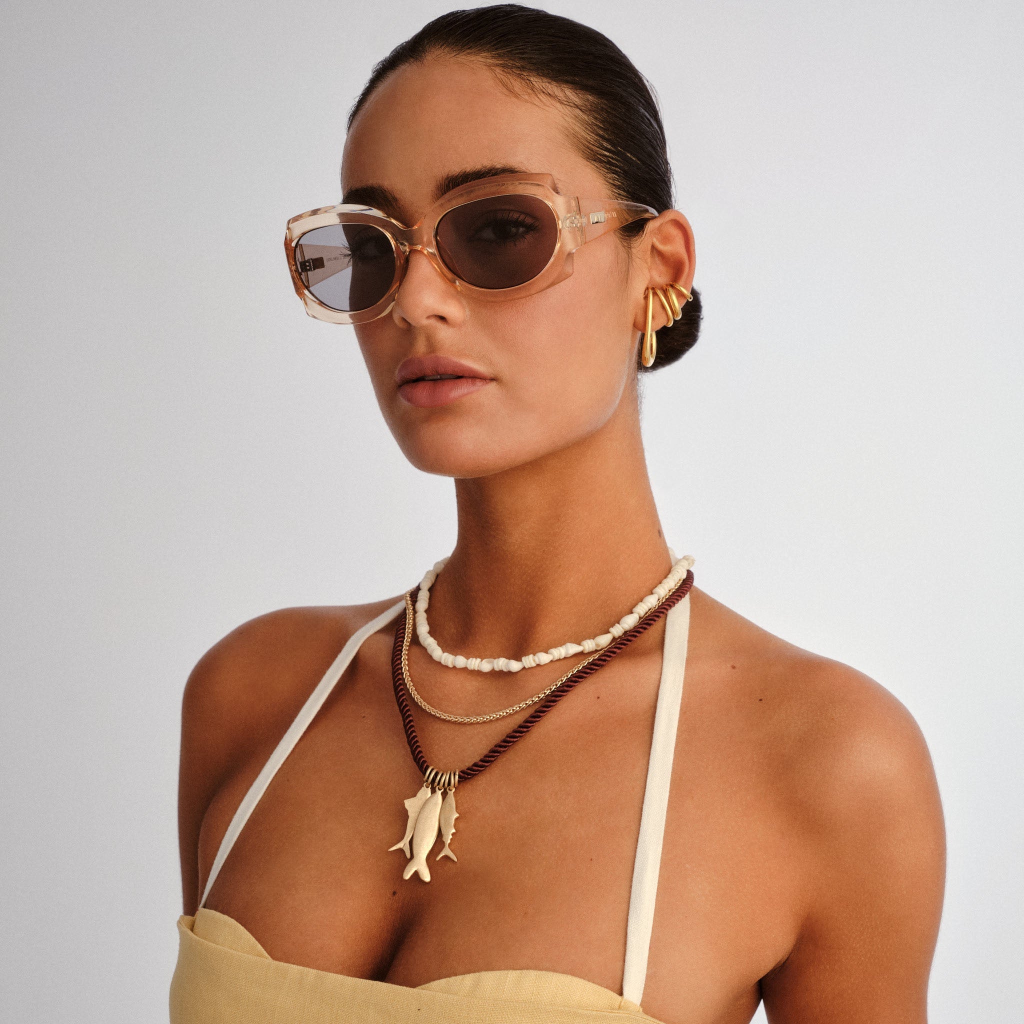 • Finished in a nude frame with smoke tint lenses.