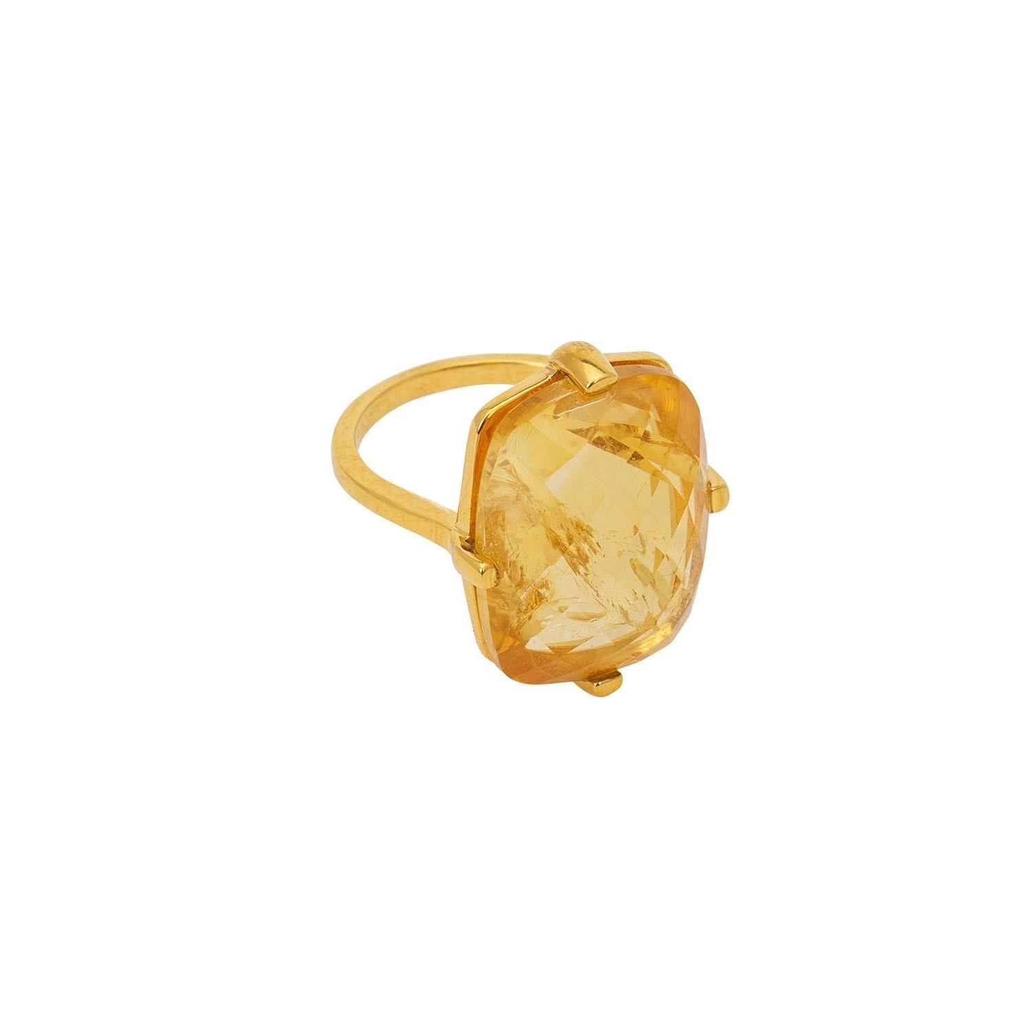 Rectangular ring, yellow gold plated brass base, 18 carats 3 microns. Citrine semi-precious stone in rectangular shape, faceted cabochon, bezel set.