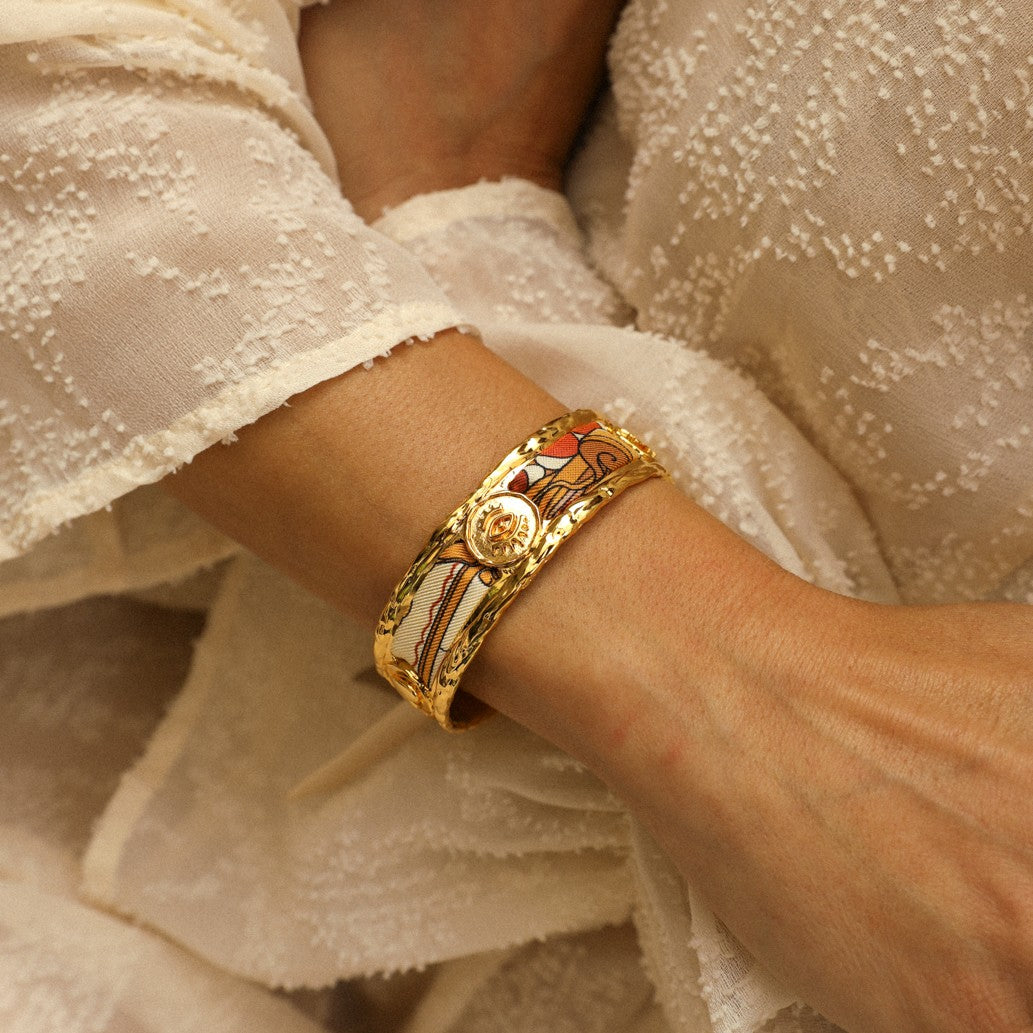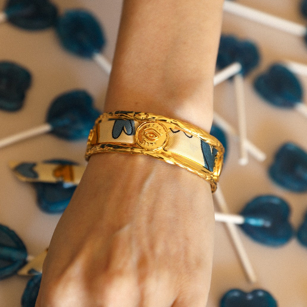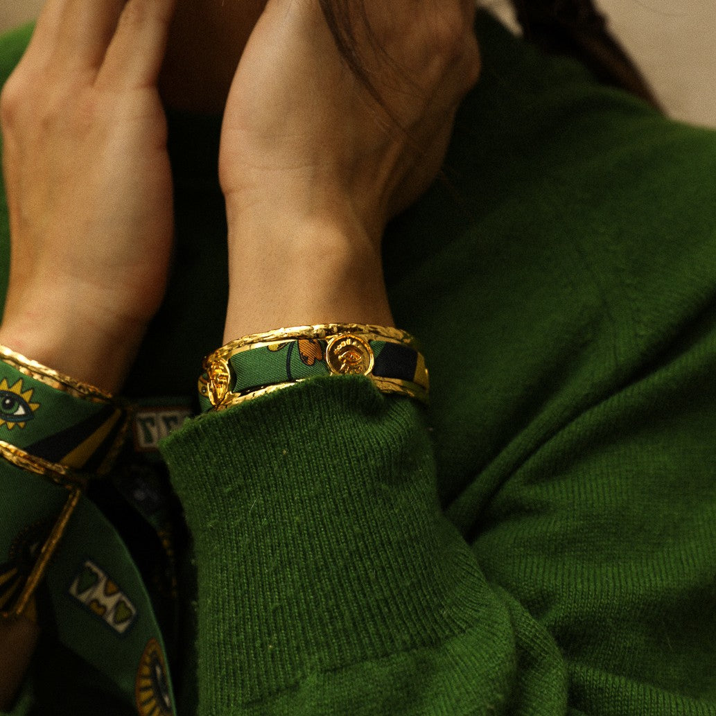The Irma Cuff is our latest bohemian addition to the Gypsy Tales collection, inspired by its sister cuffs, the Moon and Sun. Like a protective talisman, it features three embossed medallions: an eye, a heart, and a clover.