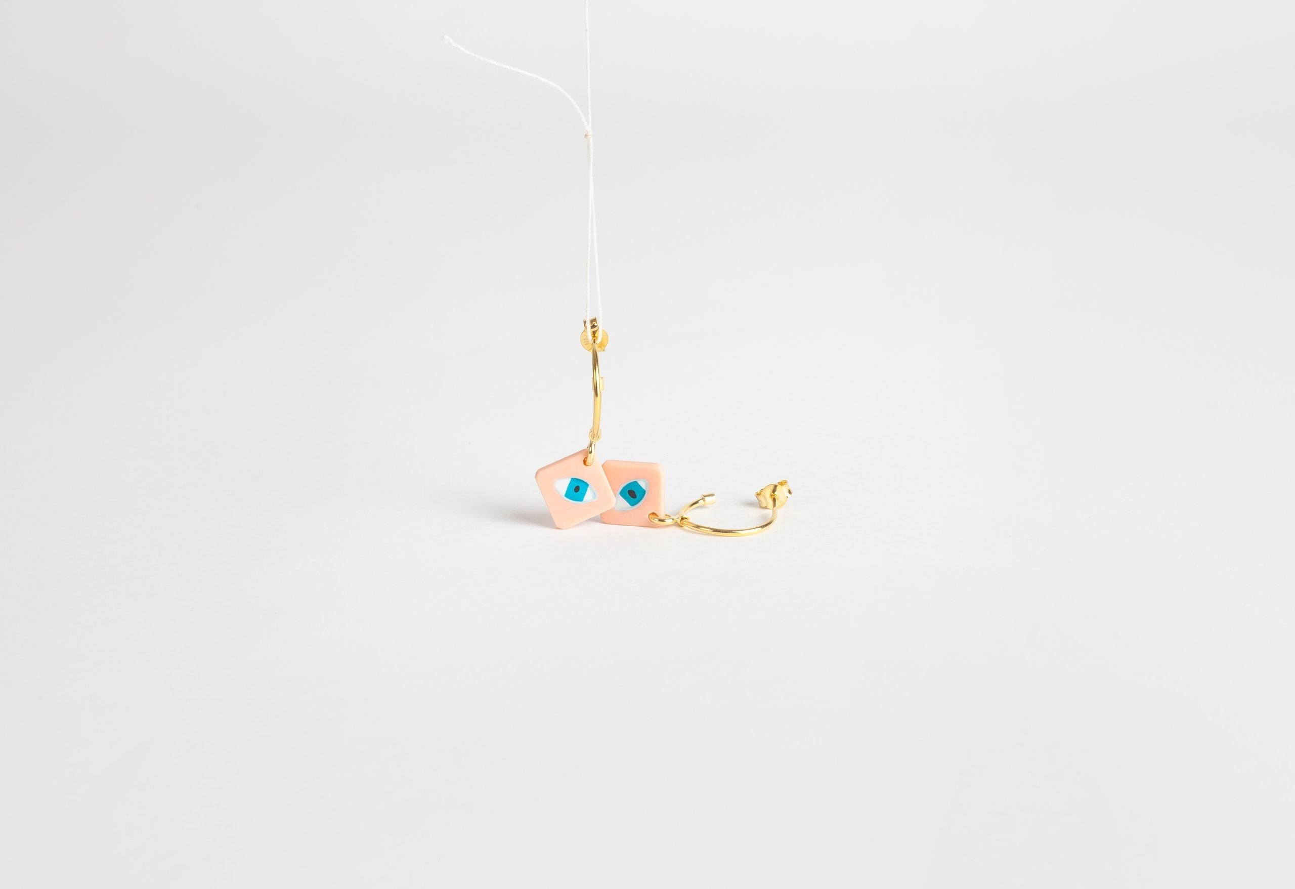 The Tweyes is our lucky charm for 2022. A Hopeful charm for a promising year! The collection has 4 types distinguished by color (stone paste: coral pink, lapis lazuli, turguoise, aventurine) and shape. This is the tweyes turquoise rectangle. The collection is made entirely of silver 925 and has an extra gold plating option as material choice.