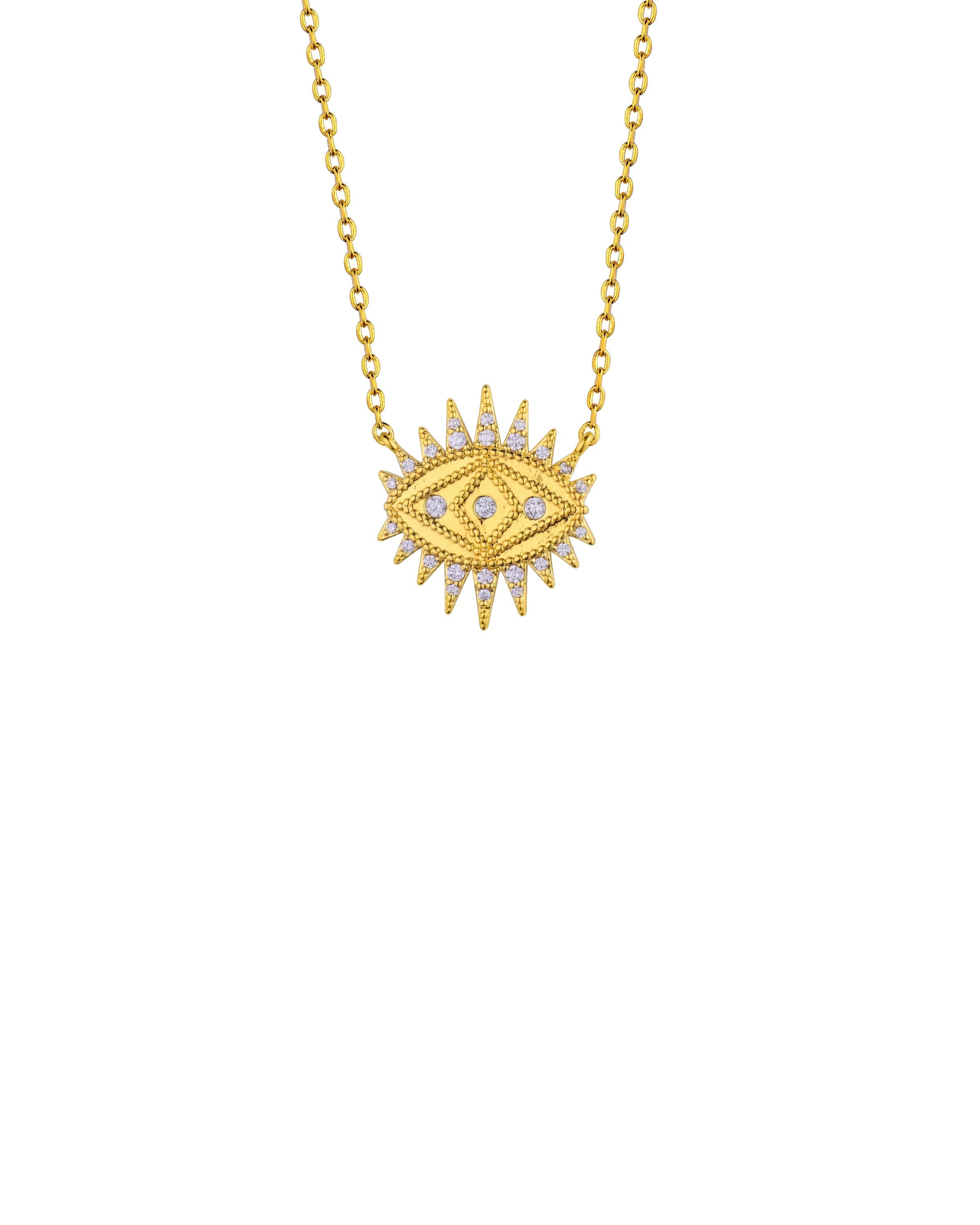 Its open-eye pendant, delicately crafted and set on a fine chain, catches both the light and the imagination.