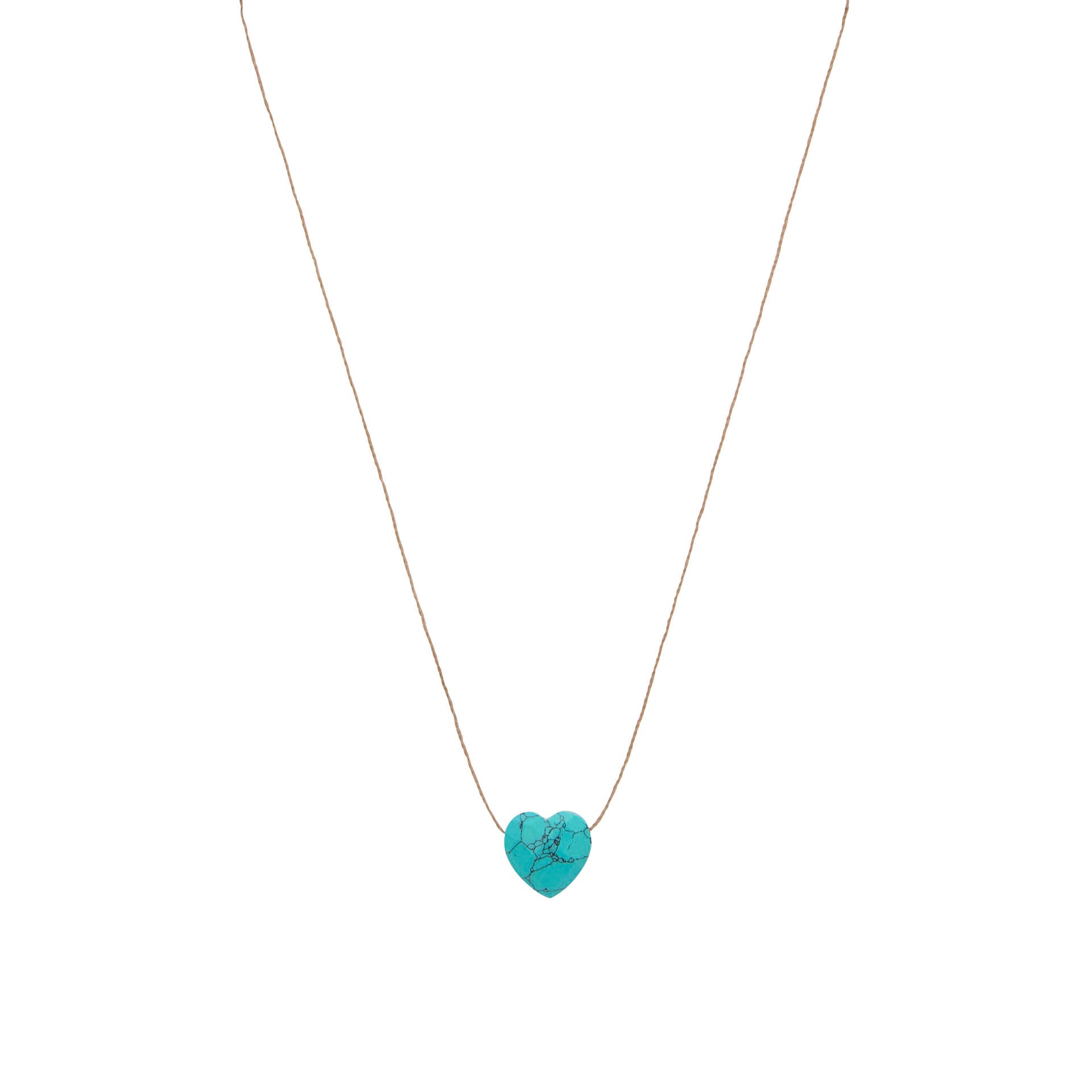 Express your love with this delicate heart drop necklace. Its ideal length of 38 cm showcases a beautiful turquoise stone carved into the shape of a heart, suspended on a durable, almost invisible flesh-colored wire. This piece embodies simplicity and sophistication, perfect for enhancing your everyday outfits or adding a romantic touch on special occasions.